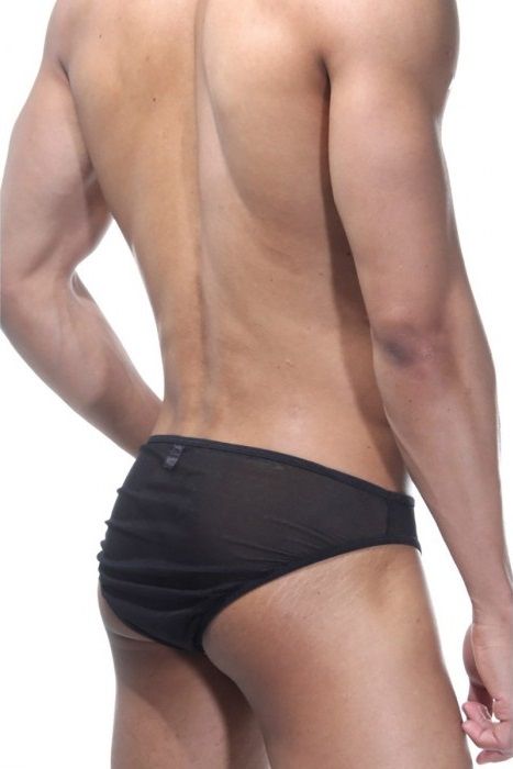 Черно-белые слипы для мужчин с низкой посадкой. На ягодицах и по бокам полупрозрачная черная тонкая ткань, а спереди белая вставка из кружева.