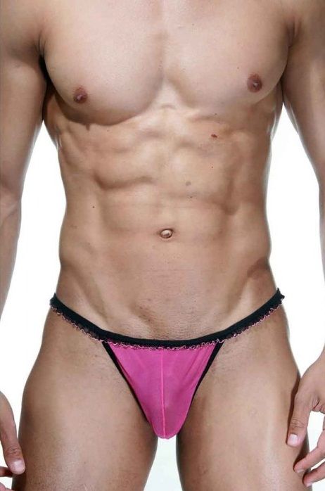 Розово-черные трусы-стринги с рюшей.