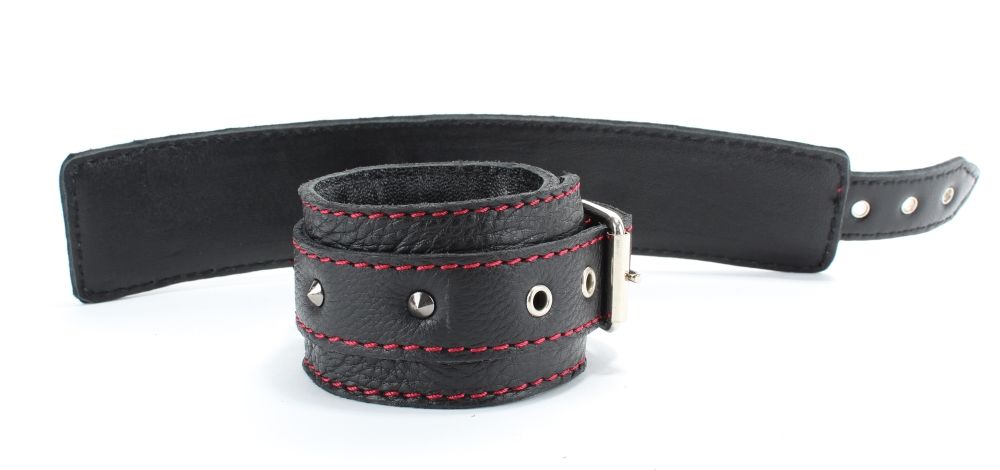 Оживить эротические игры Вам помогут поножи. Этот интимный аксессуар пользуется успехом. Выполненные в черном цвете с красной строчкой и украшены шипами. Модный интимный аксессуар не сдавливает и не нарушает кровообращение, так как изготовлен из мягкой кожи. Чтобы любимая никуда не убежала, поножи соединены короткой перемычкой. Длина перемычки - 6 см. Ширина оков - 5,3 см.