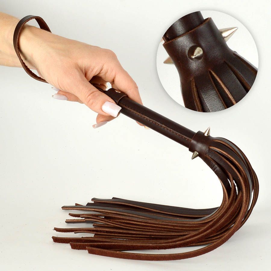 Плеть изготовлена из натуральной коричневой кожи и украшена тремя металлическими шипами. Длина шипов - 1 см.