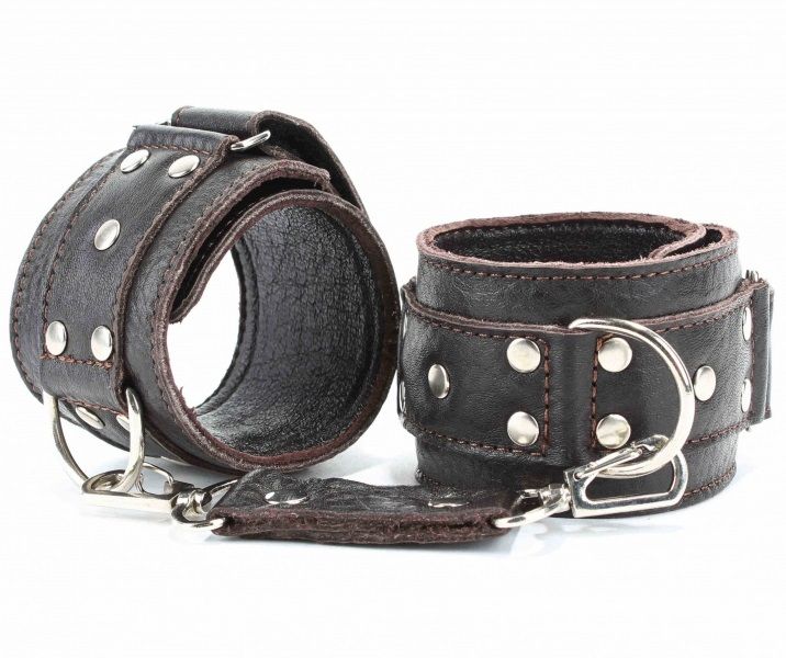Кожаные наручники потрясающего коричневого цвета.Украшены заклепками и соединяются между собой цепью с карабинами. Размер наручников регулируется при помощи застежки-липучки Ширина - 5 см.